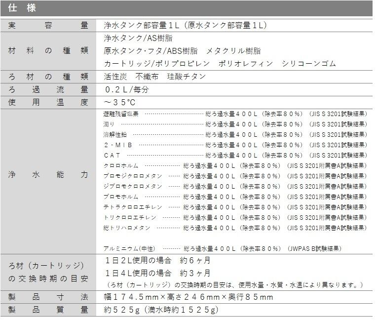 天然素材(ココヤシのヤシ殻)から作ったマイクロ活性炭を搭載したカートリッジはJIS規格13項目を